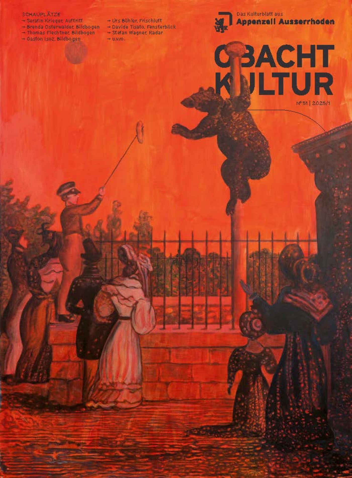Obacht Kultur No. 51 begibt sich auf Spurensuche zu Schauplätzen und Orten, an denen sich Schauerliches und Schönes abspielt(e). In vier Gesprächen geben Kulturschaffende Einblick in ihr persönliches und berufliches Verhältnis zu Orten: Die Schauspielerin Julia Buchmann begegnet in einem Filmprojekt den Orten ihrer Kindheit neu. Der Fotograf Gaston Isoz folgt in seiner Arbeit Lebensstationen eines Raubmörders. Die Regisseurin Danielle Fend-Strahm inszeniert ihre Stücke an Orten, die erst durch die Aufführung zur Bühne werden. Und Barbara Auer hat Leben und Werk Robert Walsers mit Herisauer Orten verwoben. Künstlerische Beiträge von Brenda Osterwalder, Thomas Flechtner und nochmals Gaston Isoz zeigen, wie sehr der Blick auf das Detail, auf Alltägliches oder vermeintlich Nebensächliches Orte auflädt. Die Bilder im Heft und die Kunstedition von Serafin Krieger in der Heftmitte dokumentieren, verfremden, interpretieren – und laden dazu ein, Bekanntes neu zu sehen. Weitere Textbeiträge umweben das Thema Schauplätze im engeren oder im weiteren Sinn. Stefan Wagner nimmt die Grenzverläufe der Förderung im Kanton Thurgau auf den Radar. Davide Tisato eröffnet einen poetischen Blick aus dem Zugfenster. Und Urs Bühler spielt in seiner szenischen Miniatur mit Ort und Erwartung. Schliesslich steuern die Gedächtnis-Institutionen Beiträge zu unterschiedlichsten kulturellen Schauplätzen im Appenzellerland bei. Man erfährt zum Beispiel etwas darüber, wie neue Impulse Dorfkerne beleben, wie das audiovisuelle Kulturgut der Säntis Schwebebahnen digitalisiert wurde, warum es auf dem Stoss zwei Schlachtdenkmäler hat, was es mit dem Streit um eine Leiche auf der Chozeren in Oberegg auf sich hat und was aus dem alten Waldstätter Bahnhof geworden ist.